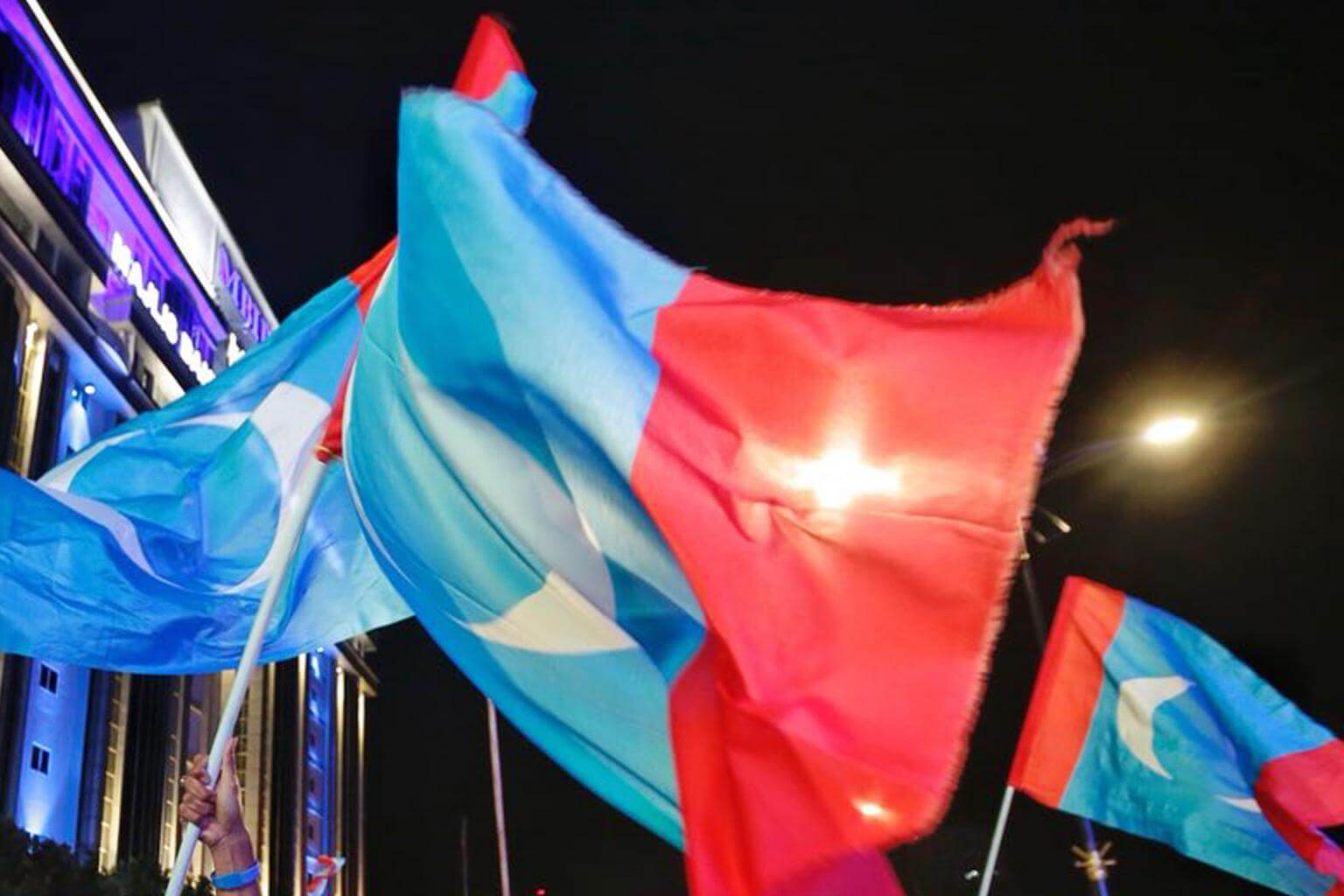 Supporters of Pakatan Harapan waving the party flags, celebrating outside Majlis Bandaraya Iskandar Puteri, Johor Baru in the early morning of May 10, 2018.