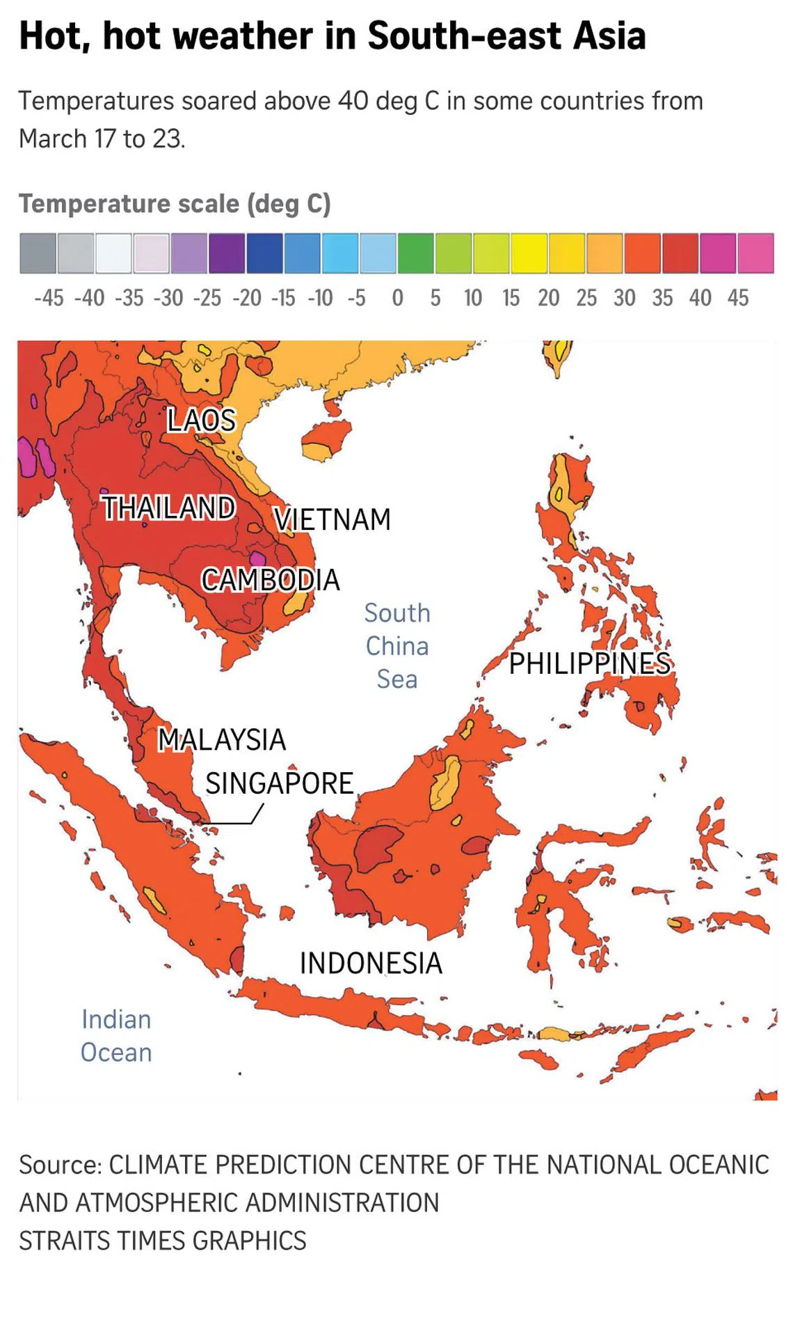 Temperatures topped 40 deg C in parts of Thailand, Cambodia, Laos and Myanmar, while hitting at least 35 deg C in Malaysia, Indonesia and the Philippines in the week of March 17 to 23, latest data from the Climate Prediction Centre at the US’ National Oceanic and Atmospheric Administration showed.