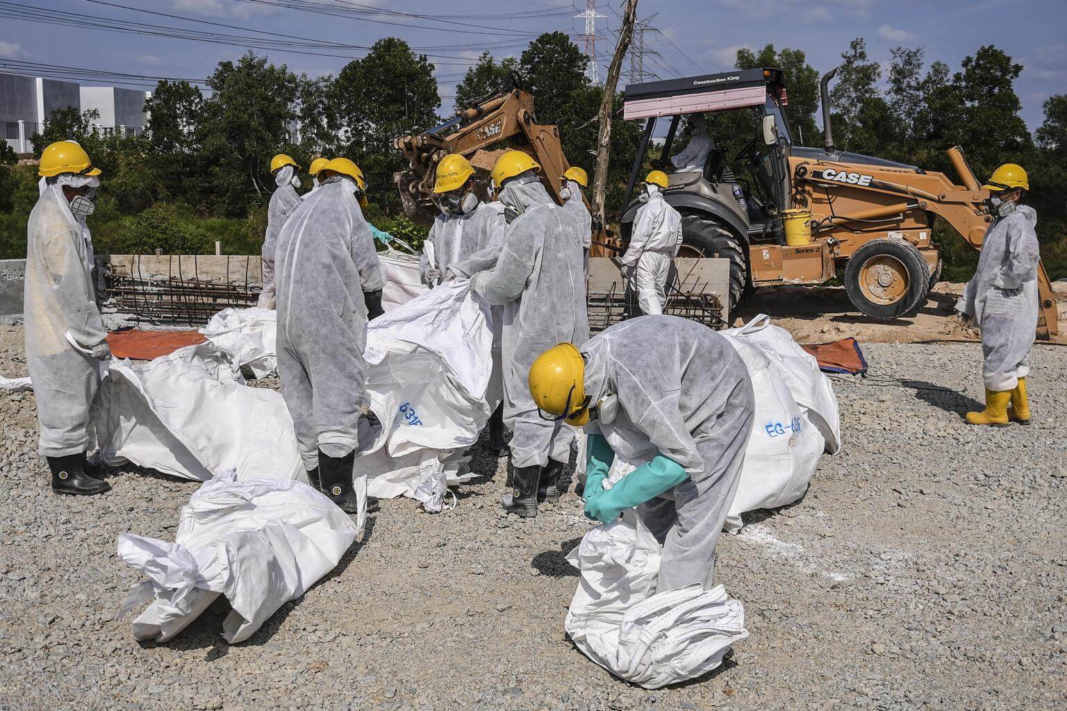 Emergency personnel wearing protective suits prepare to clean up the Sungai Kim Kim river in Pasir Gudang, on March 14, 2019.
