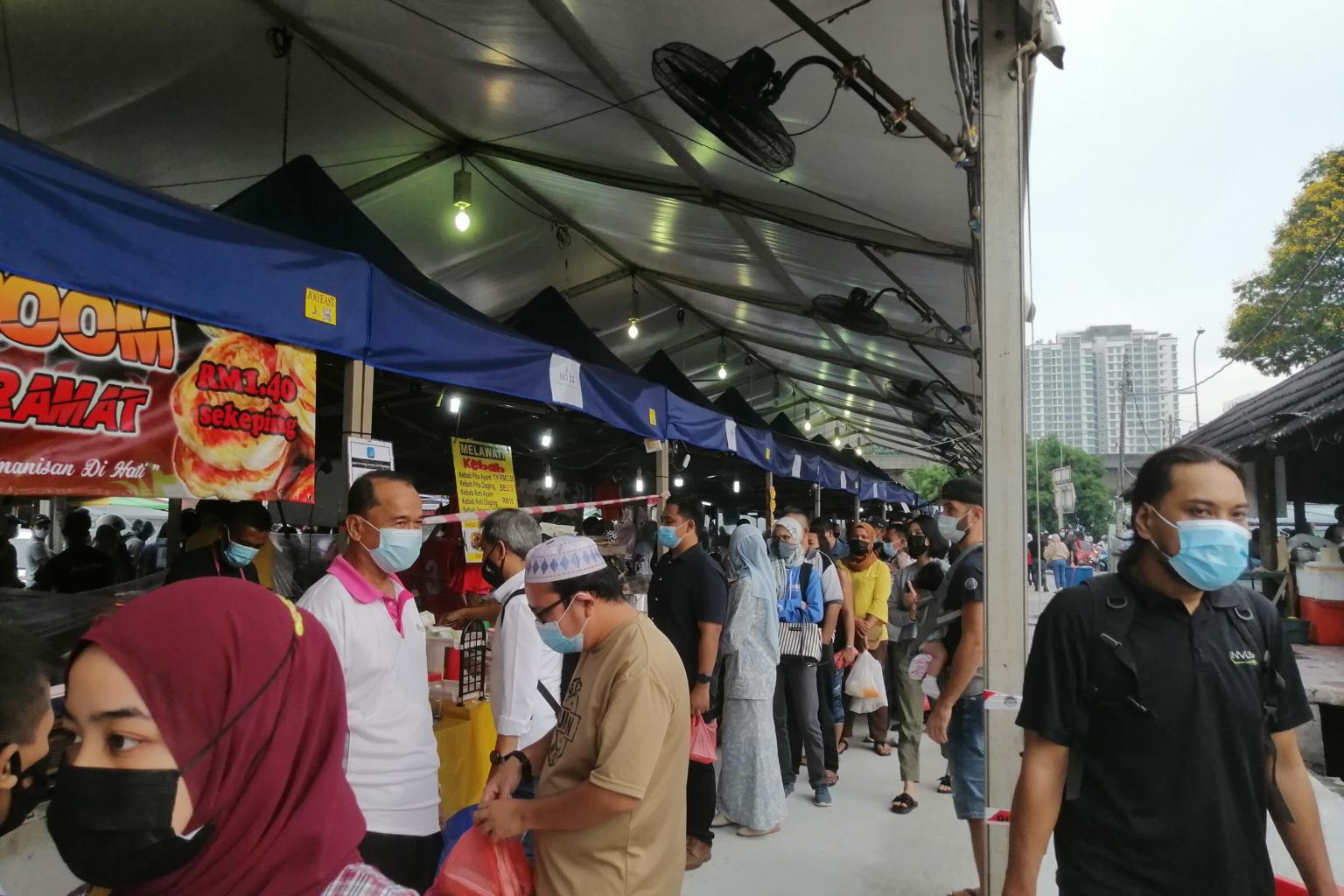 Crowds queue closely at the Ramadan bazaar in Kuala Lumpur, on April 16, 2021.