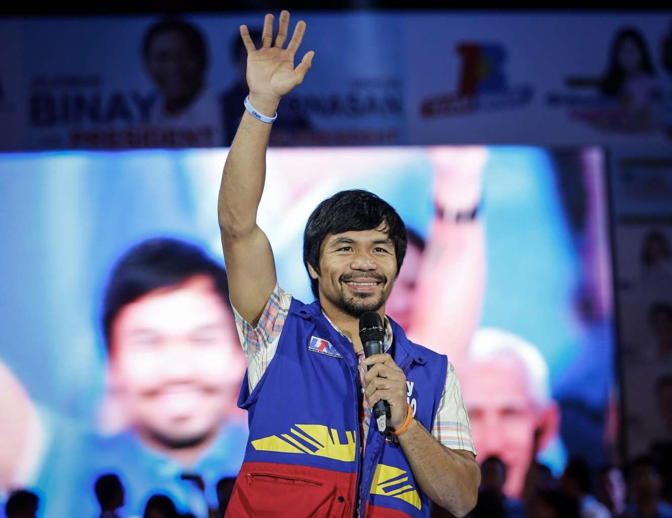 Filipino boxing champion and senate candidate Manny Pacquiao gestures during the last presidential candidates' campaign rally, in Manila, on May 7, 2016.