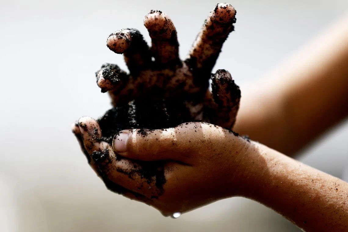 A boy holding sand washed ashore with an oily substance along the Limao coastline in the Philippines.