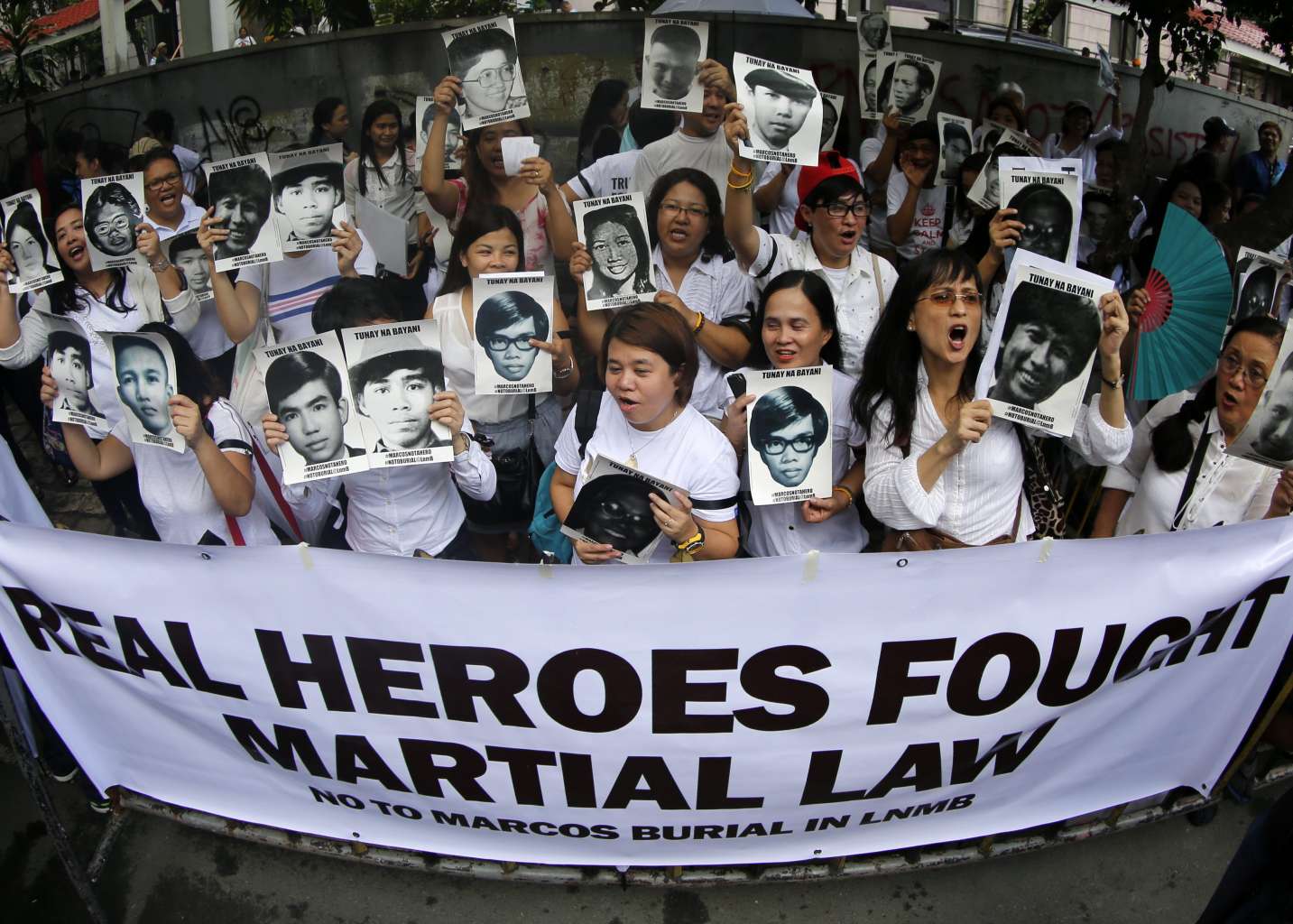 People protest against the burial of late Filipino dictator Ferdinand Marcos at the Heroes cemetery in front of the Supreme Court in Manila on Sept 7, 2016.