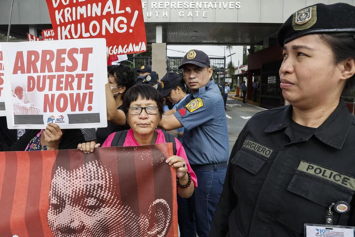Protesters call for the arrest of former president Rodrigo Duterte during a rally outside Congress on Nov 7.