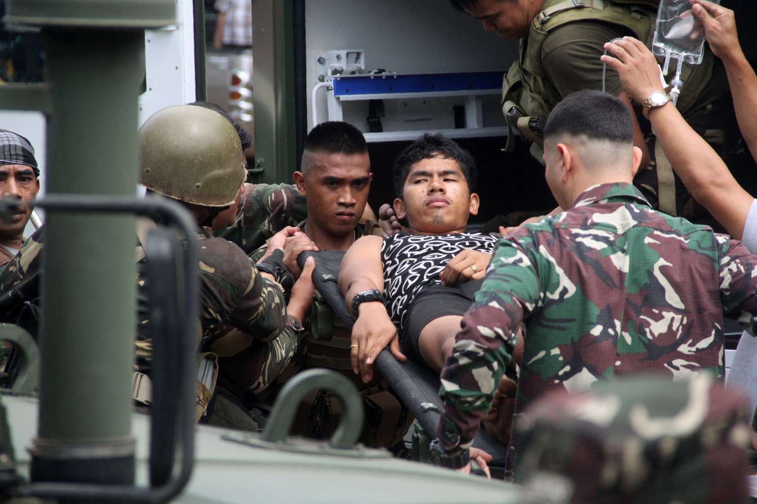 Philippine soldiers, wounded in an ongoing clash with Abu Sayyaf militants, arrive at a military hospital in Jolo on March 3, 2017.
