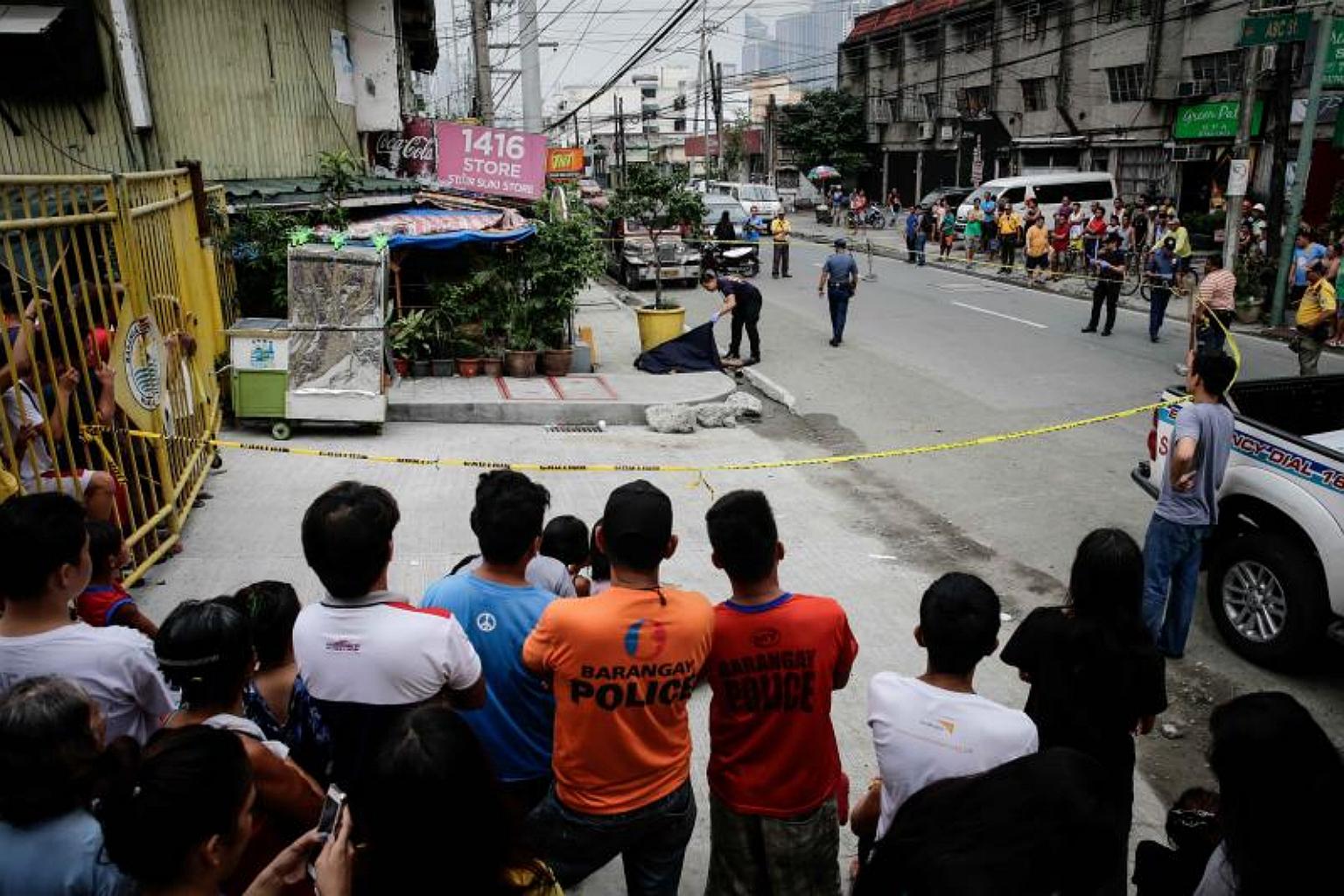 A police investigator checks the body of a man who was shot by unidentified gunmen on a motorcycle in Makati, Philippines on Oct 8, 2017. Human rights activists say vigilantes, riding pillion on motorcycles, were responsible for over 7,000 deaths.