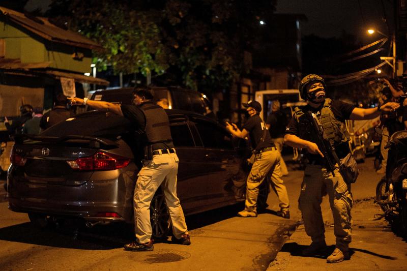 Philippine Drug Enforcement Agency agents and police secure a part of a street as they search a house during a drug raid in Taguig on Feb 28, 2018.