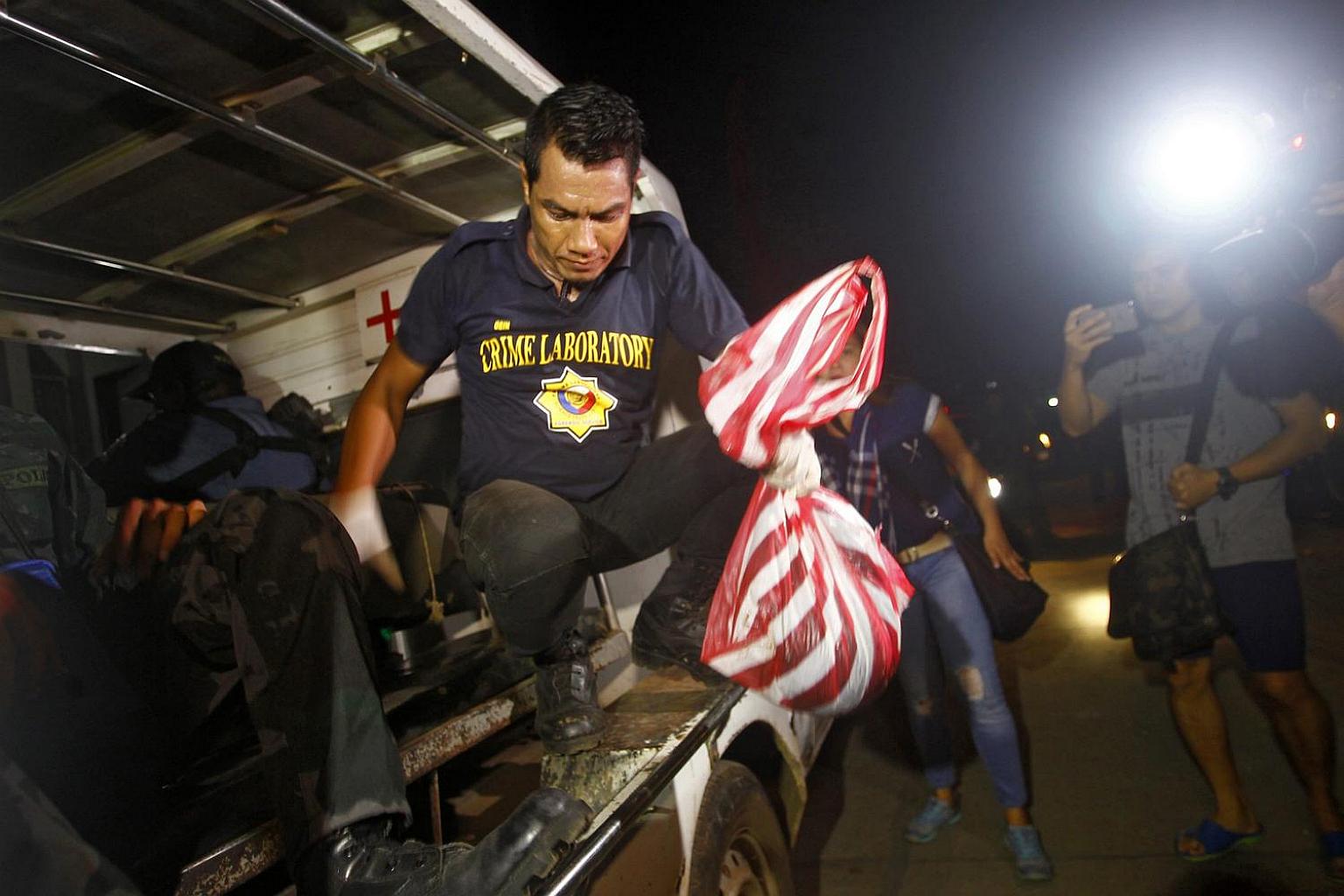 An image made available on June 14 shows a member of the Philippine National Police Scene of the Crime Operatives holding a plastic bag containing human remains in the town of Jolo, Sulu island, Philippines.