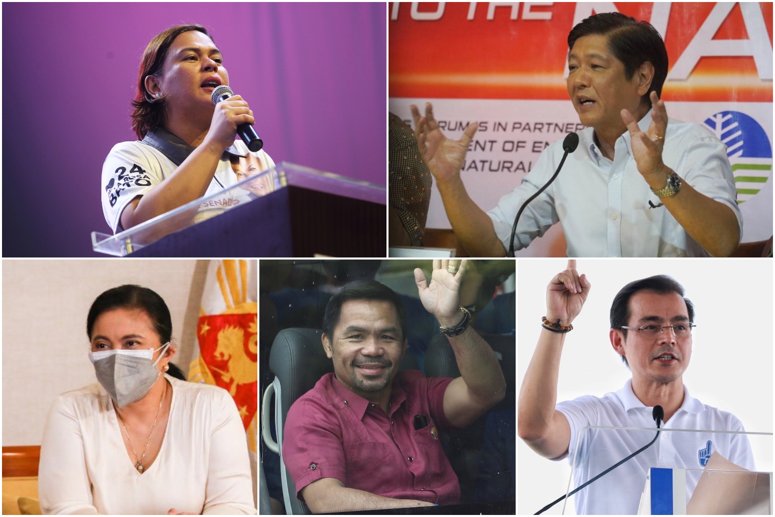 (Clockwise from left) Ms Sara Duterte-Carpio, Mr Ferdinand Marcos Jr., Mr Isko Moreno, Mr Manny Pacquiao and Ms Leni Robredo.