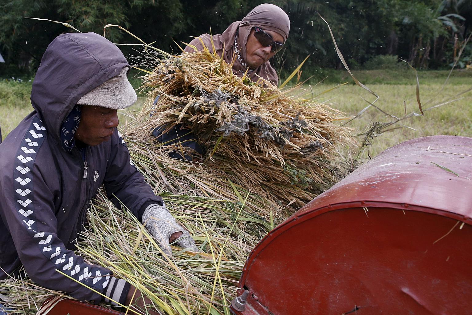 Farmers place rice stalks on a makeshift thresher to separate "Palay" grains at a rice field in Marinduque, Philippines on March 27, 2016.