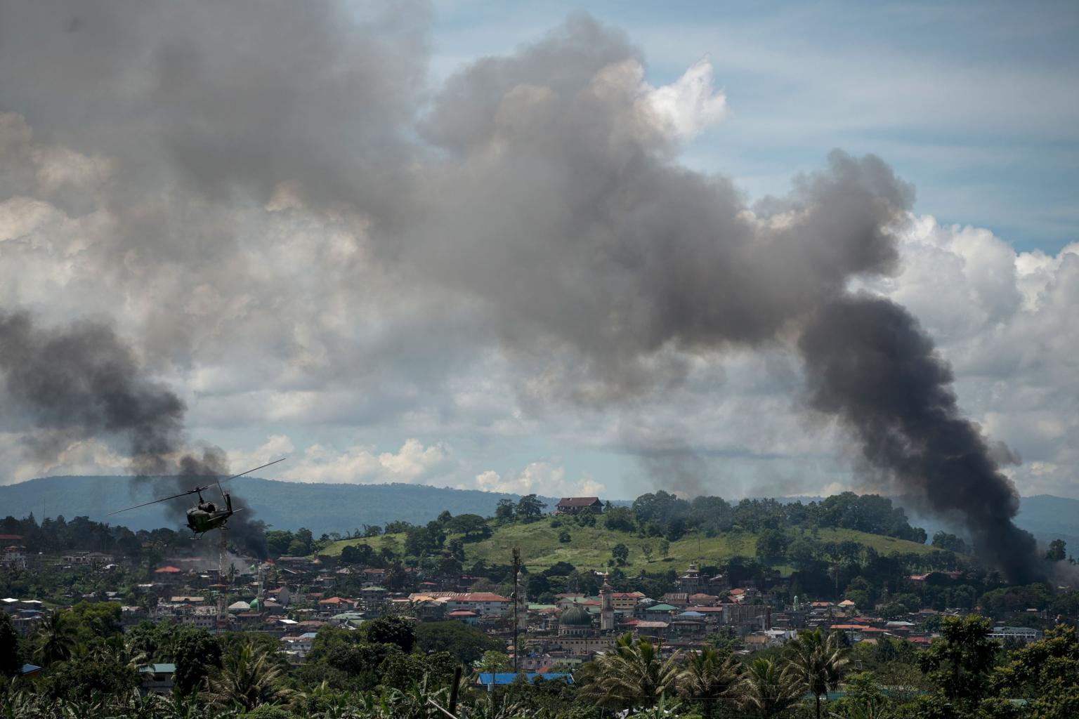 A helicopter flies through smoke billowing from houses after aerial bombings by Philippine Airforce planes on Islamist militant positions in Marawi on the southern island of Mindanao on June 17, 2017.
