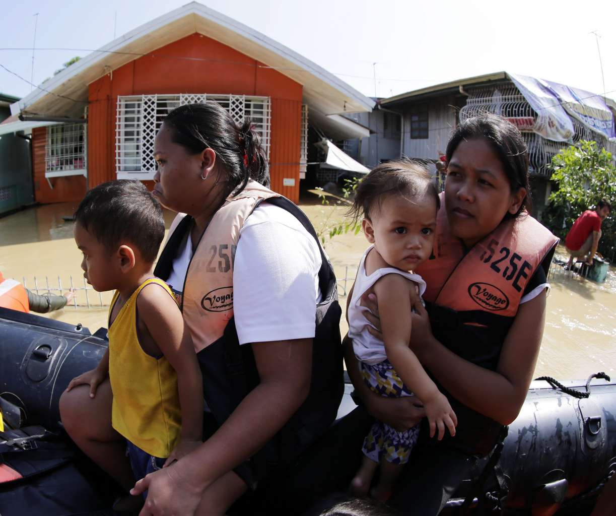 Rescued Filipino villagers ride on a rubber boat at the flood-hit town of Calumpit, Bulacan province, northern Manila, Philippines, Oct 21, 2015.