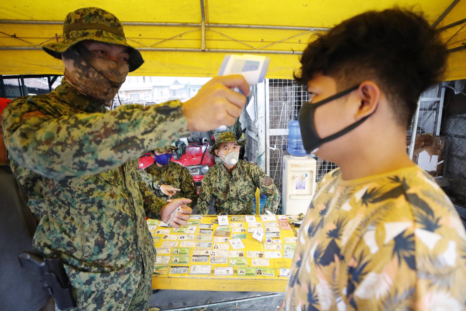 A Filipino resident has his temprature checked at a military checkpoint in Paranaque, Philippines, on March 20, 2020.