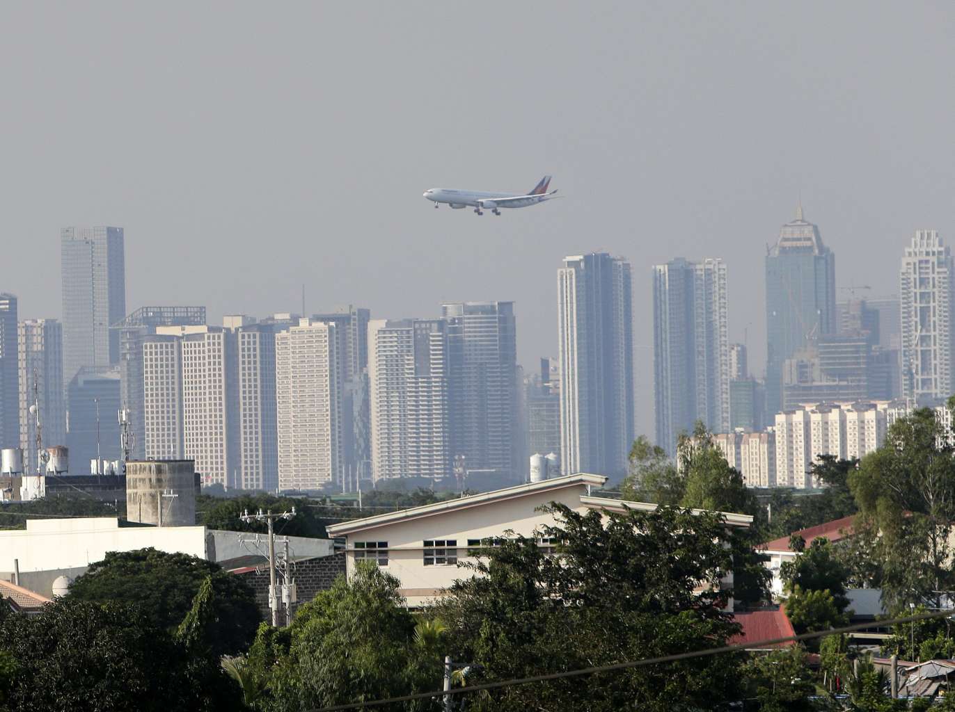 A Philippines Airlines plane prepares to land in Manila as haze from Indonesian forest fires shrouds the capital on Oct 25, 2015.