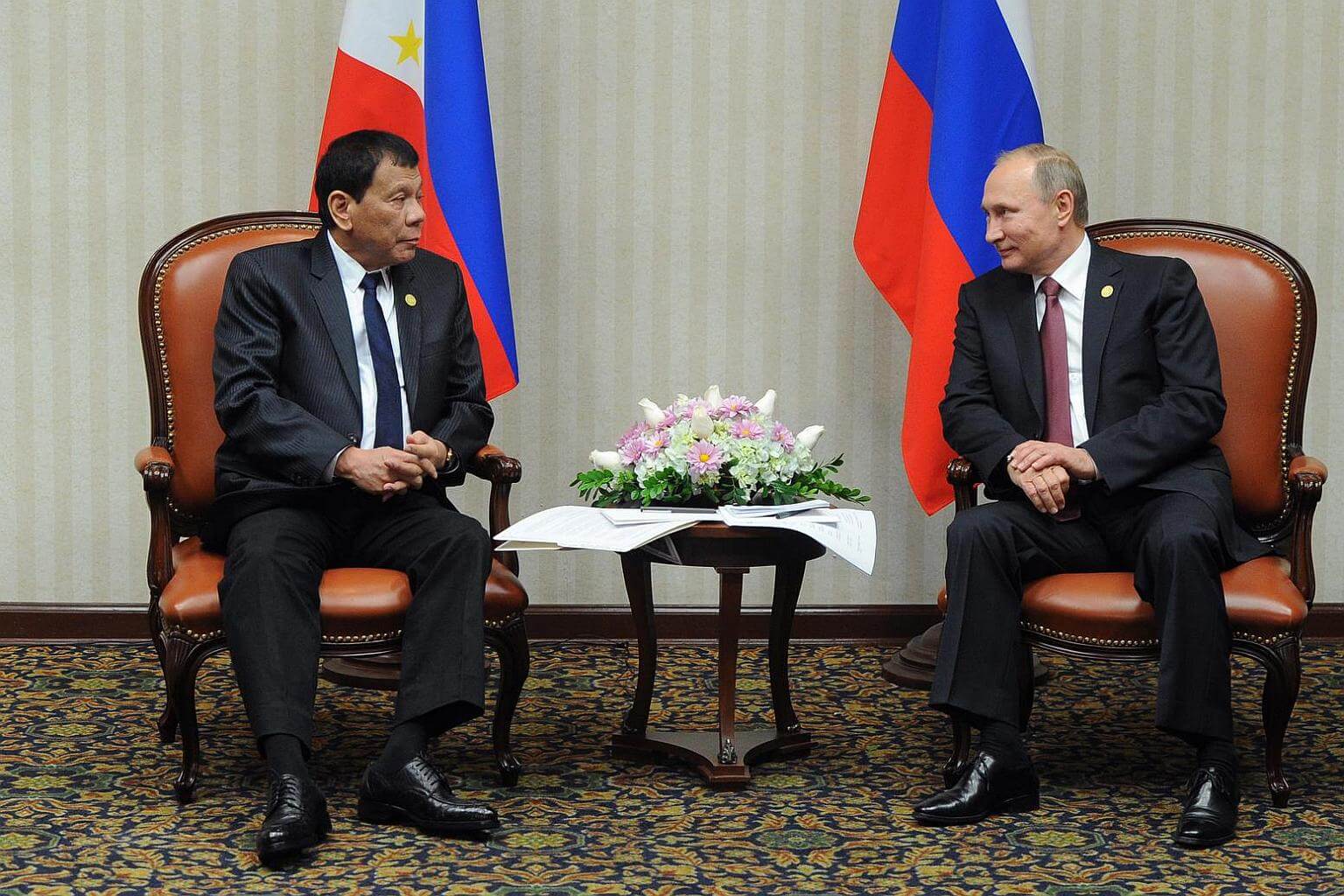 Russian President Vladimir Putin and Filipino President Rodrigo Duterte speak during their meeting in Lima, Peru on Nov 19, 2016.
