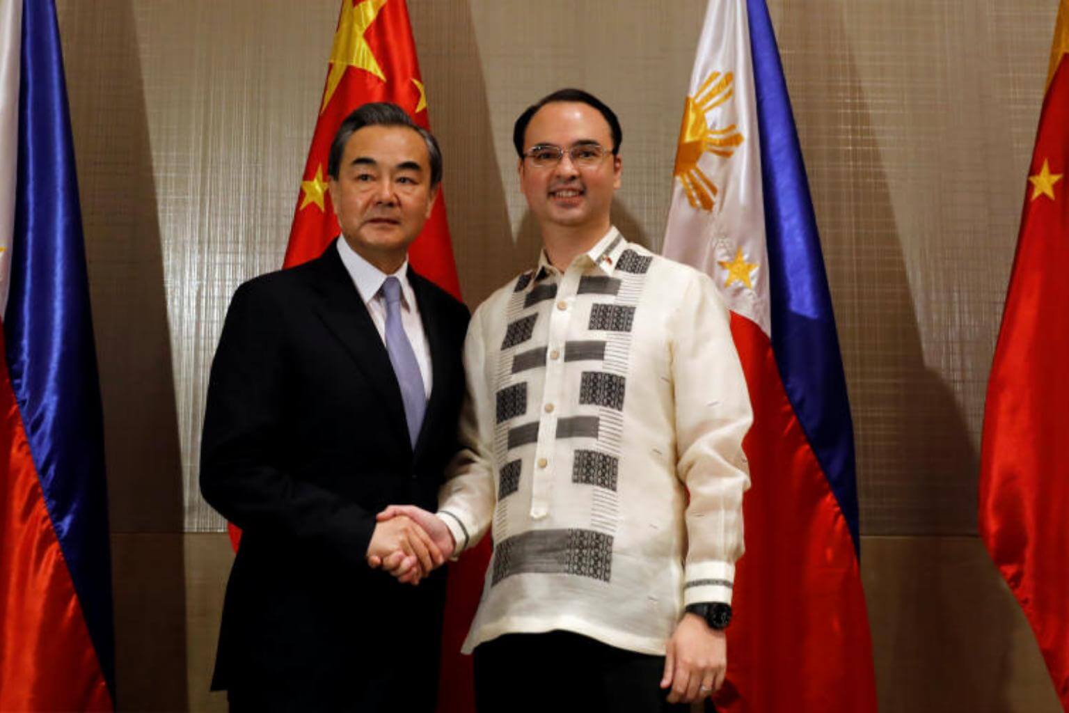 Philippine Foreign Affairs Secretary Alan Peter Cayetano (right) shakes hands with China's Foreign Minister Wang Yi in Taguig, Metro Manila, Philippines, on July 25, 2017.