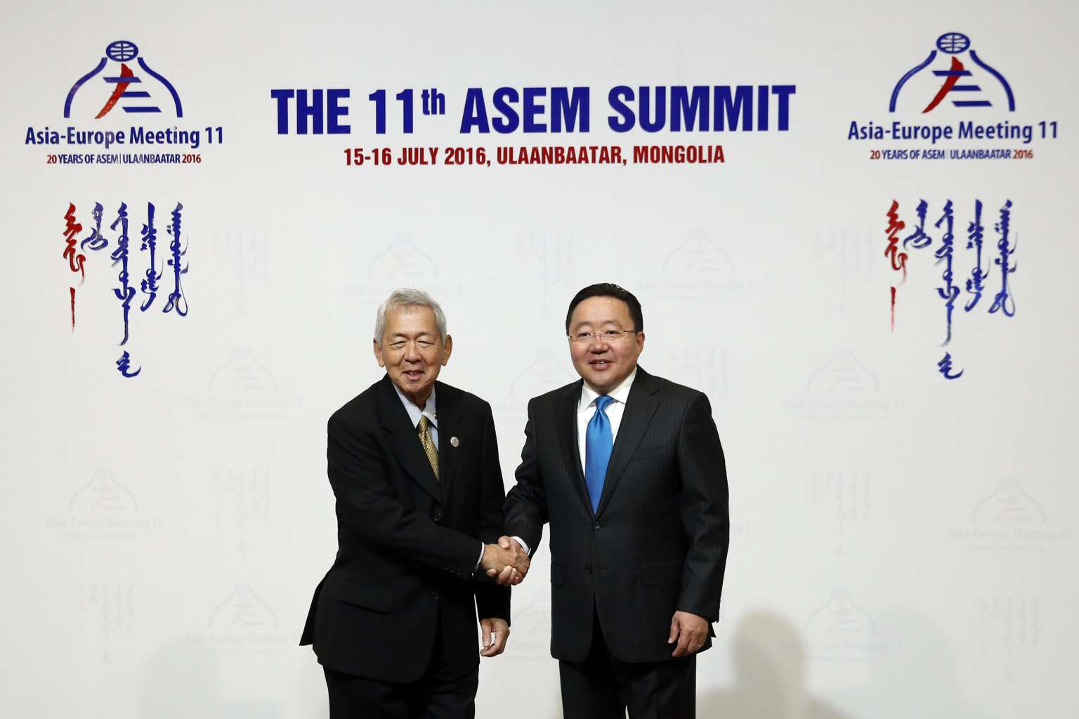 Philippine Foreign Affairs Secretary Perfecto Yasay (left) is greeted by Mongolia's President Tsakhiagiin Elbegdorj upon arrival for the opening of the 11th ASEM Summit in the Mongolian capital of Ulan Bator on July 15.
