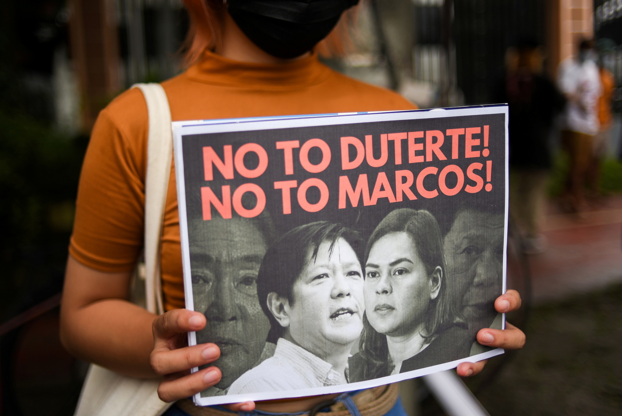 A demonstrator holds a poster during a protest following the presidential bid announcement of Ferdinand “Bongbong” Marcos Jr., in Quezon City, Metro Manila, Philippines, on Oct 6, 2021.