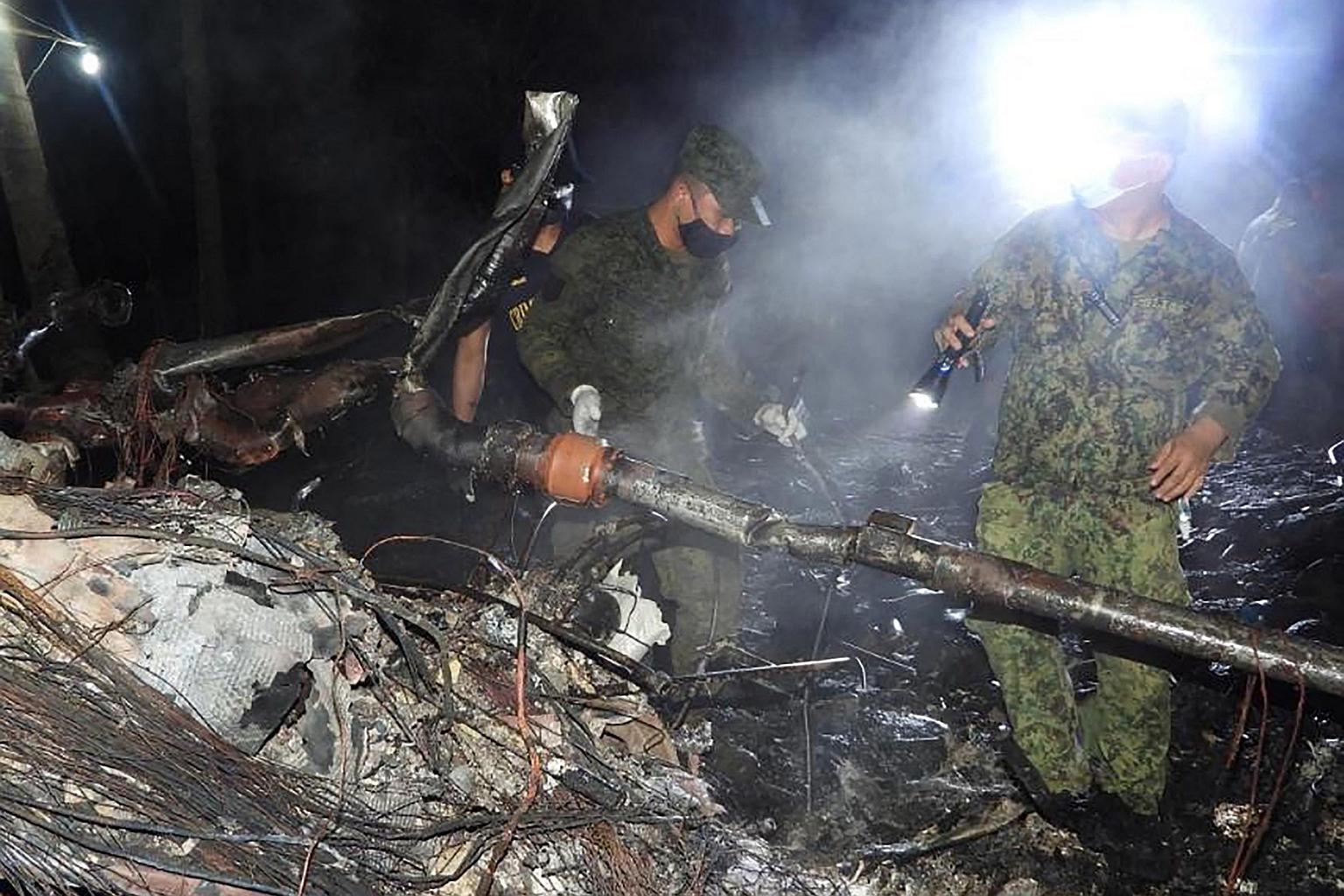 Philippine soldiers inspecting the wreckage of the C-130 transport that crashed near the airport in Jolo town, Sulu province, during search and retrieval operations on July 4, 2021.