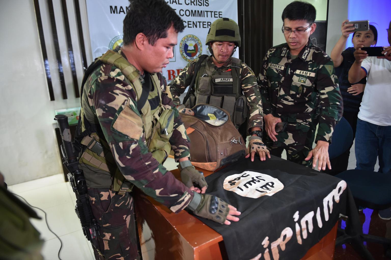 Philippine Army troopers prepare to display an ISIS flag that was recovered from an Islamist militants' position.