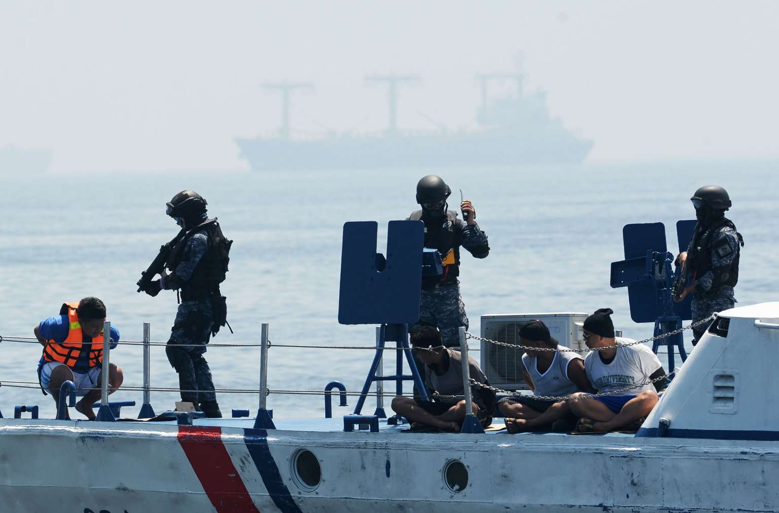Philippine and Japanese Coast Guard personnel conduct a drill on board a Philippine Coast Guard boat at an annual anti-piracy exercise off Manila Bay on July 13, 2016.