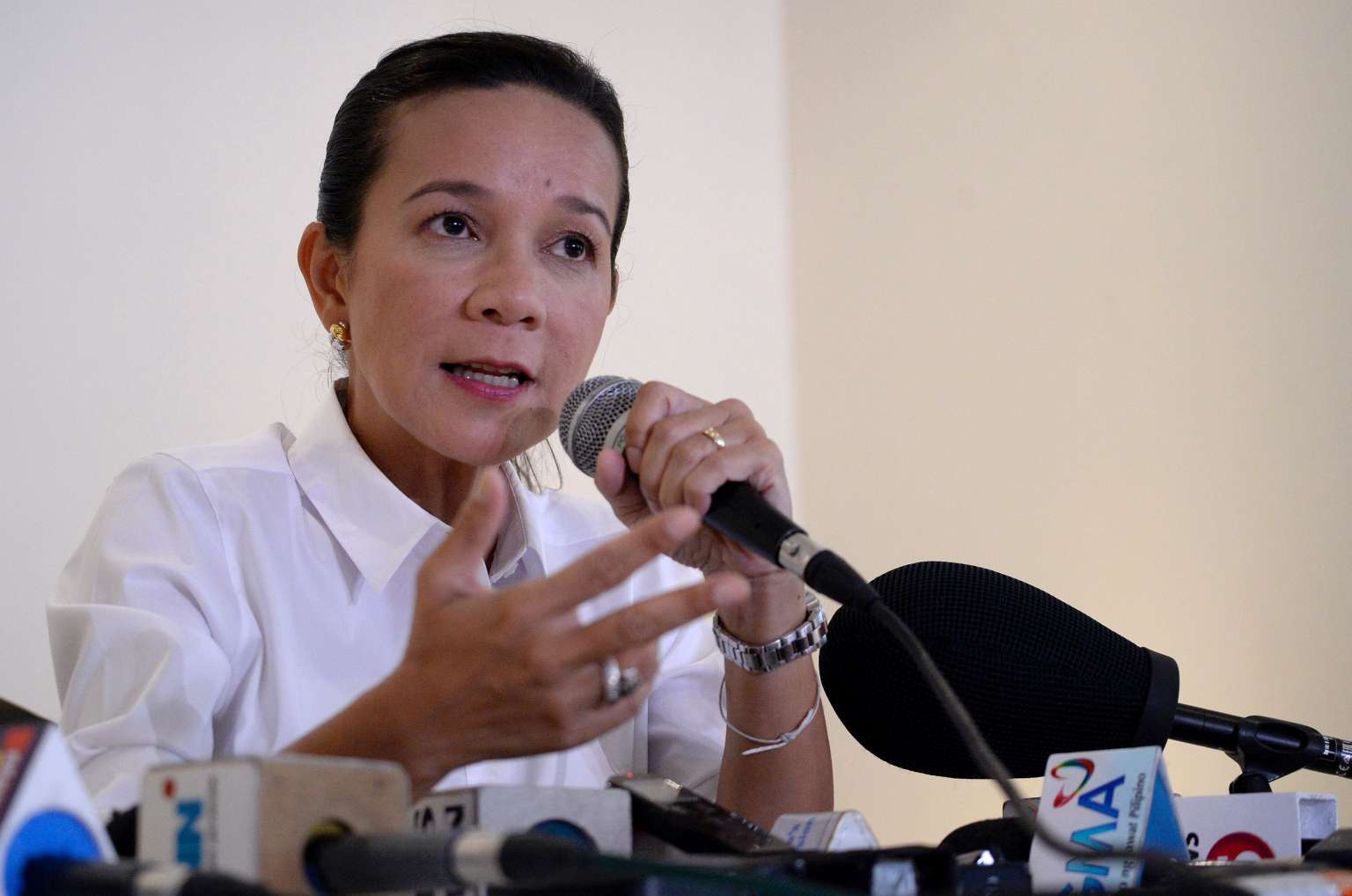 Philippine presidential candidate Senator Grace Poe gestures during a press conference in Manila on May 5, 2016.