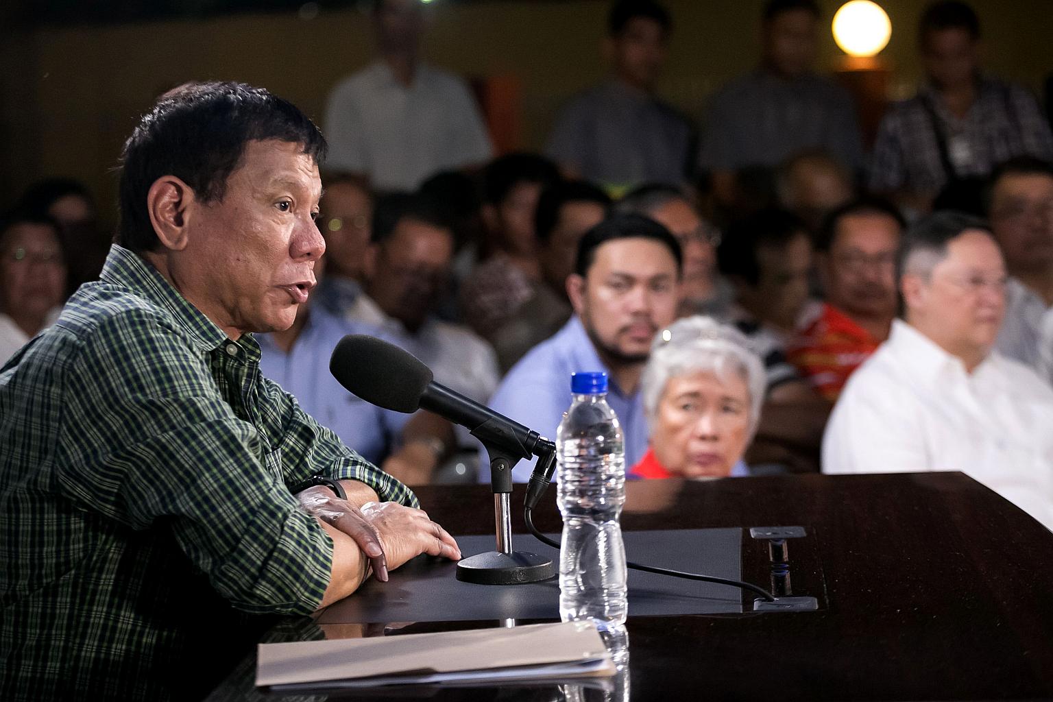Philippines' president-elect Rodrigo Duterte speaks as cabinet members look on during a press conference in Davao.