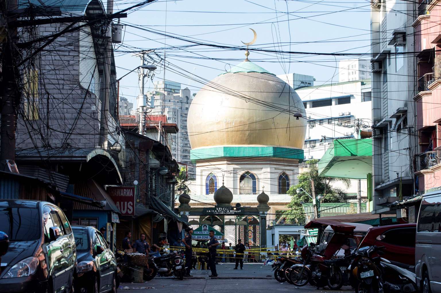 Police officers standing guard near a mosque in Quaipo, Manila, on May 6, 2017.