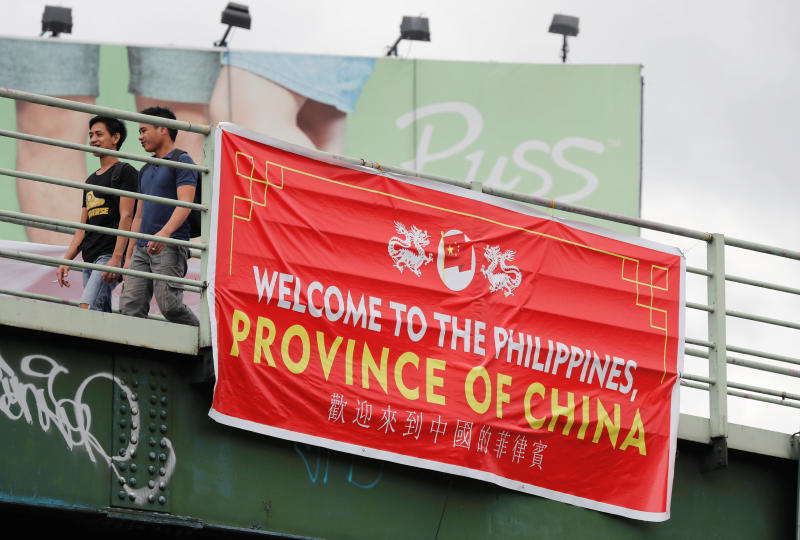 A banner reading "Welcome to the Philippines, Province of China" is displayed on an overpass along the C5 road intersection in Taguig, Philippines, on July 12, 2018.