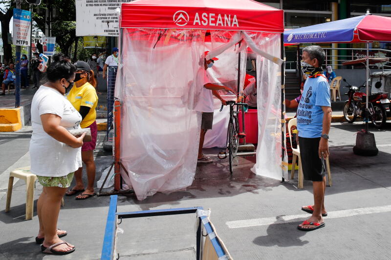People having their temperature checked and are disinfected in Manila, Philippines, on April 6, 2020.