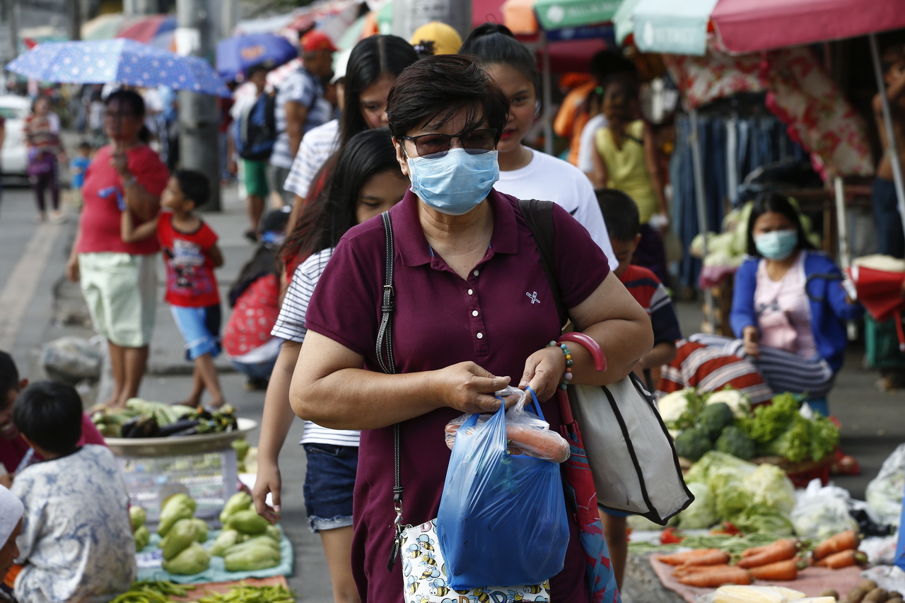 A Filipino wearing a protective mask carries a bag of vegetables at a roadside market in Quezon City, Philippines, on Feb 29, 2020.