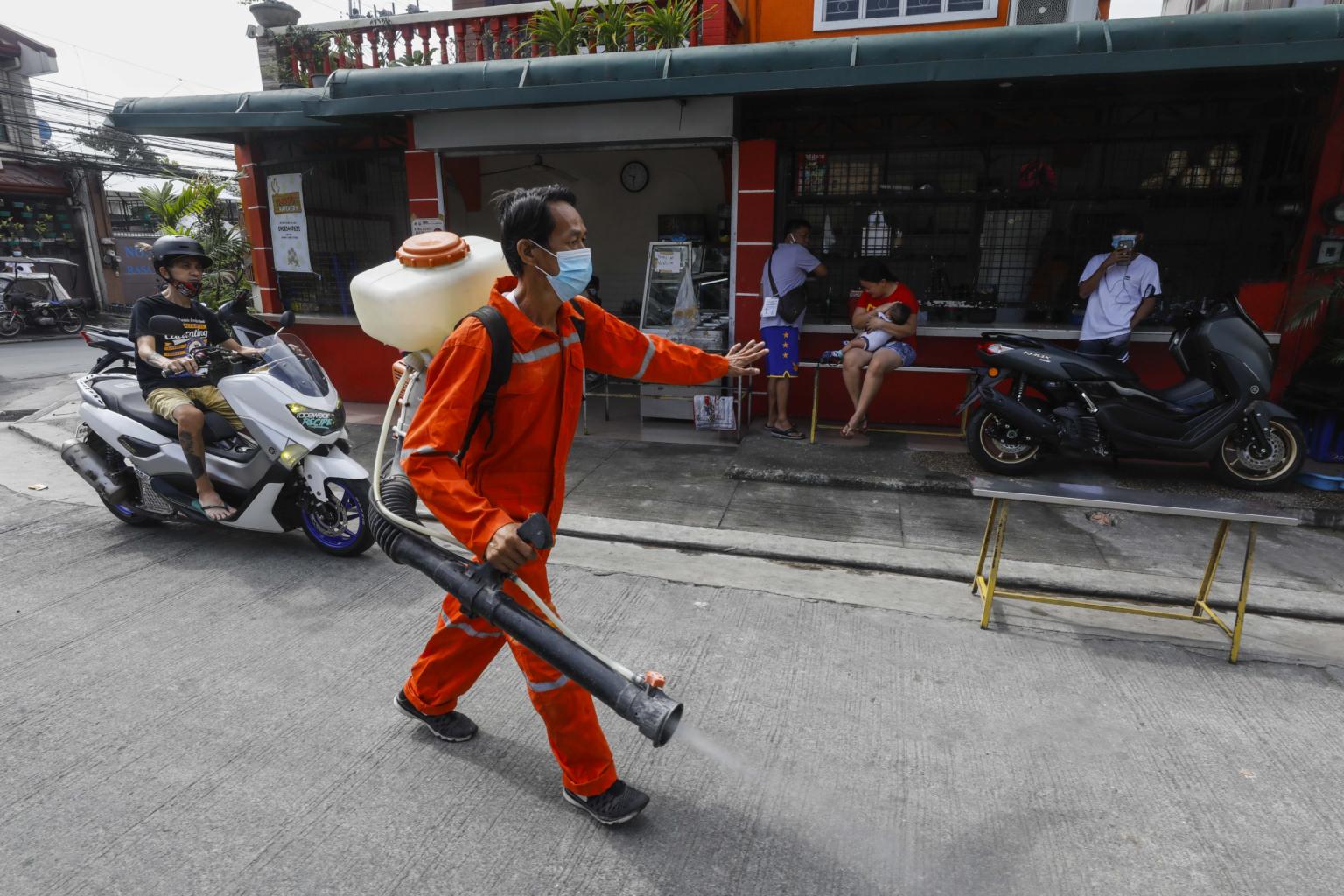 A worker disinfecting streets in Quezon City, Metro Manila, on March 17, 2021.