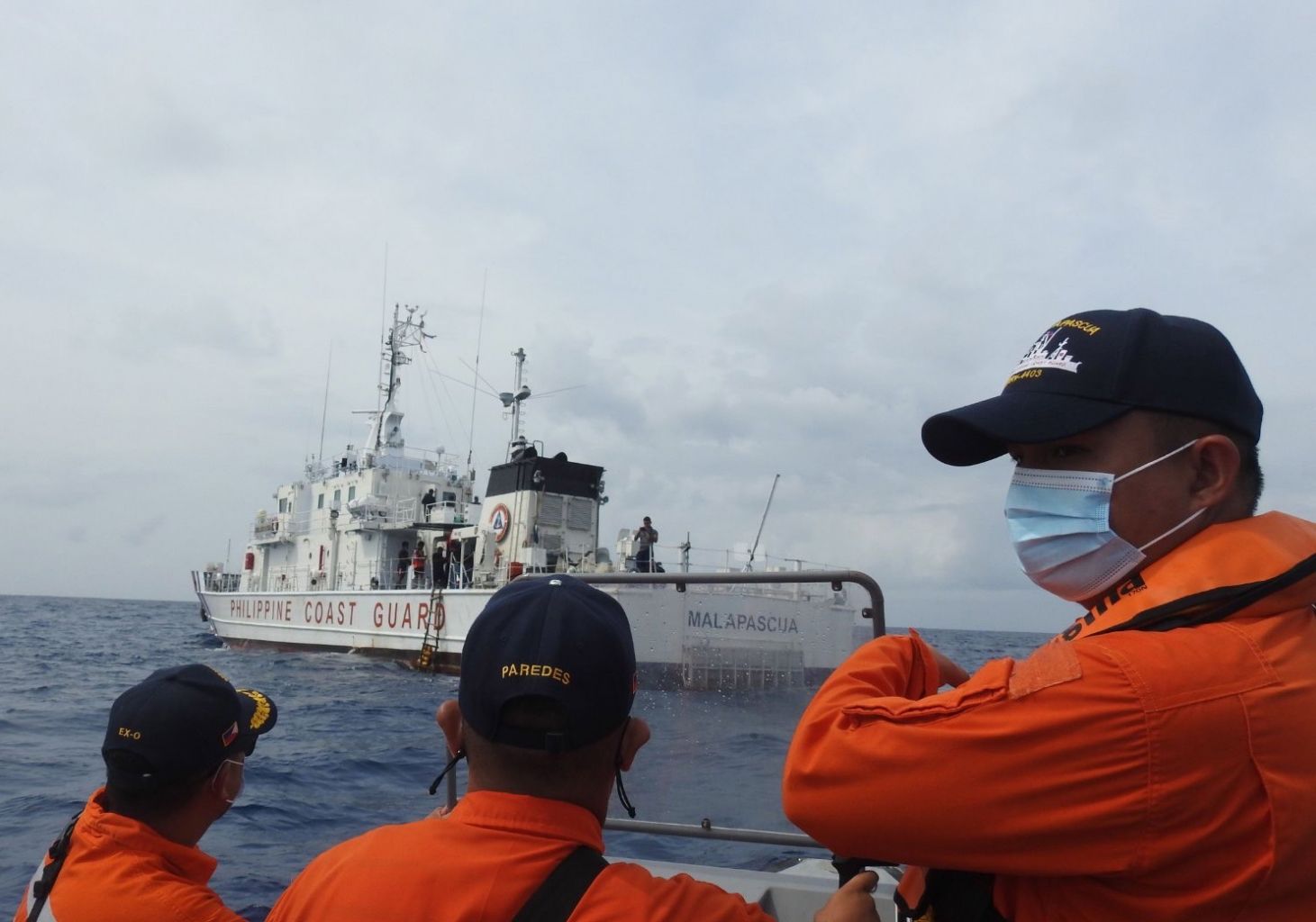 Philippine Coast Guard personnel conduct maritime exercises in the disputed South China Sea on April 24, 2021.