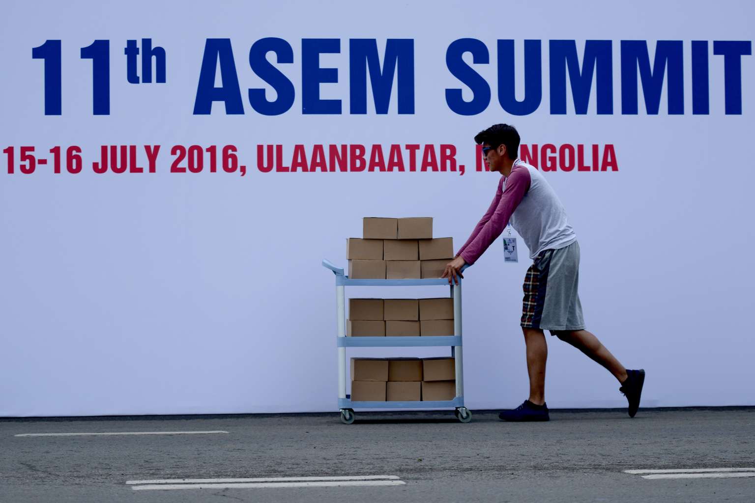 A man pushes a trolley past a poster of the 11th Asia-Europe Meeting (Asem) at Sukhbaatar Square in Ulaanbaatar, on July 14, 2016.