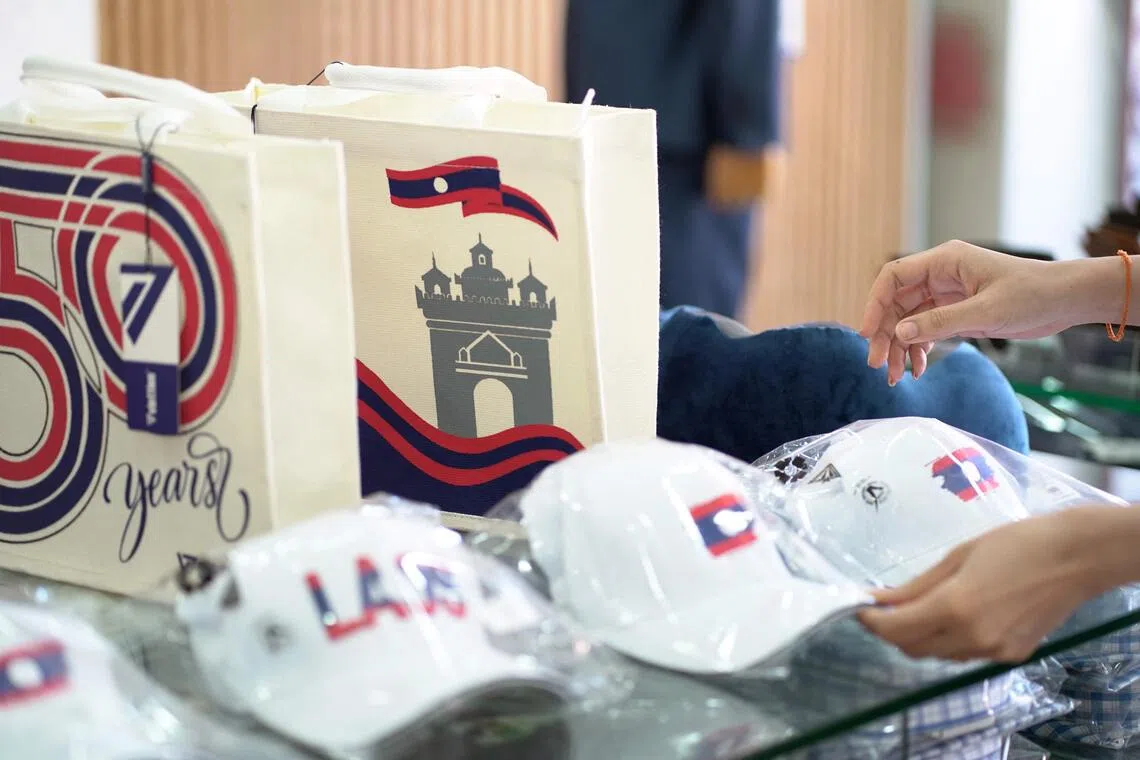 A vendor arranging items at a shop selling souvenirs to celebrate 50 years of communist rule in Vientiane.