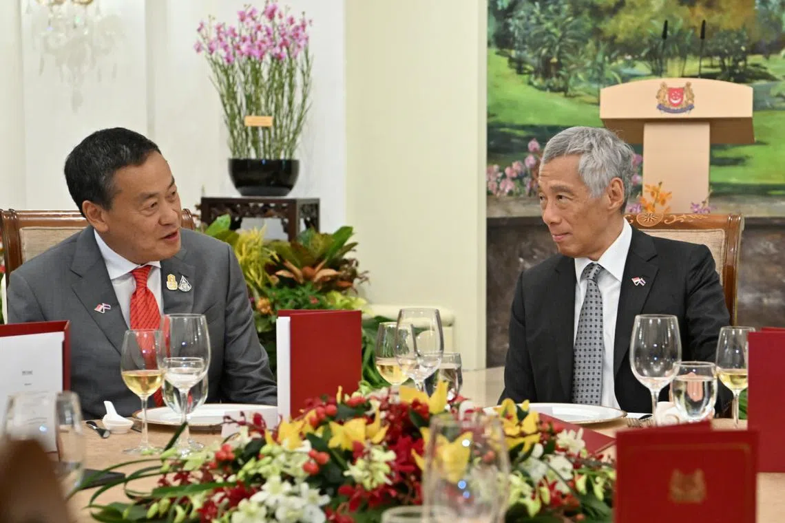 Prime Minister Lee Hsien Loong (right) with his Thai counterpart Srettha Thavisin at the Istana on Oct 12.