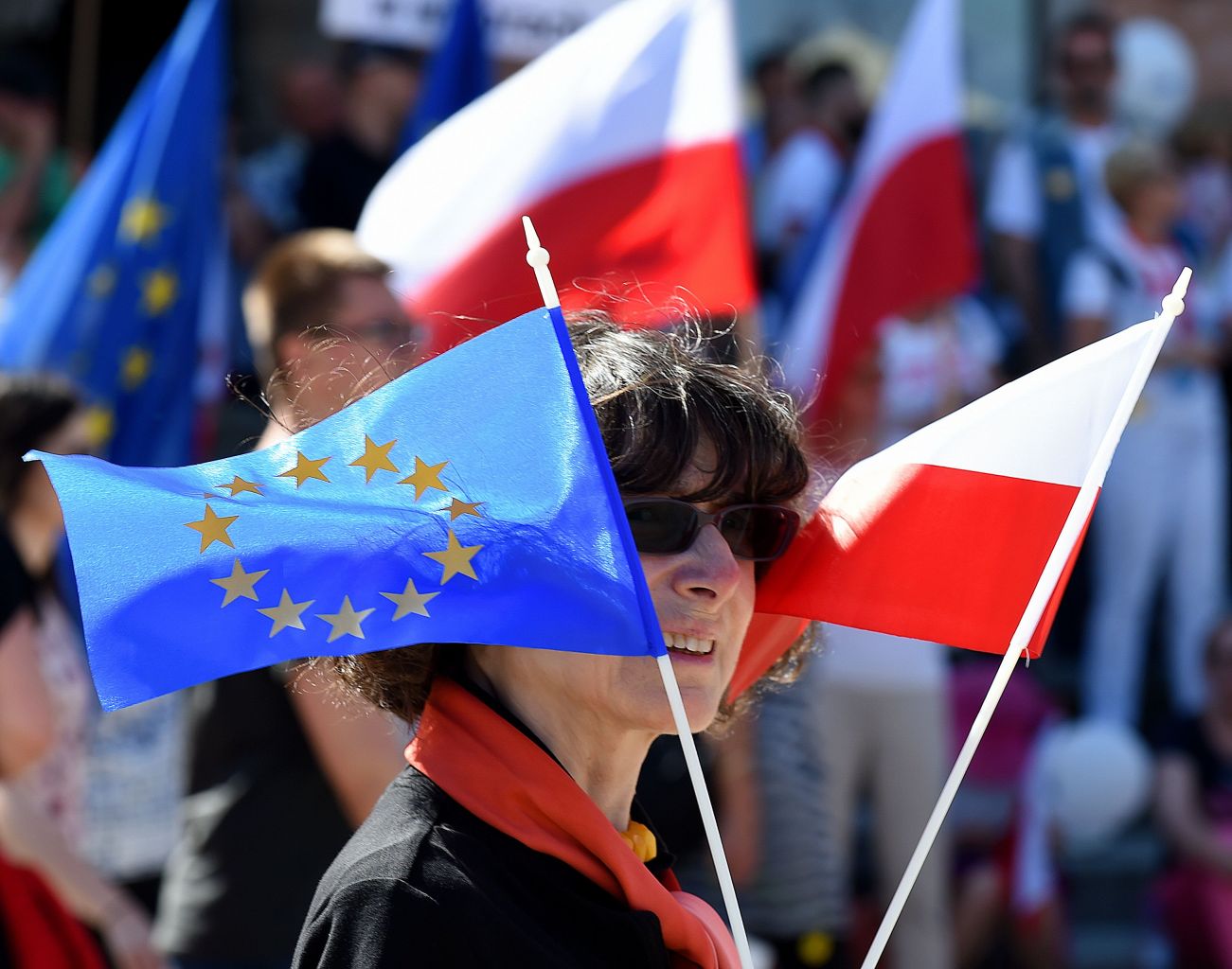 A woman holding Polish and EU flags during a protest against Poland's right-wing government.