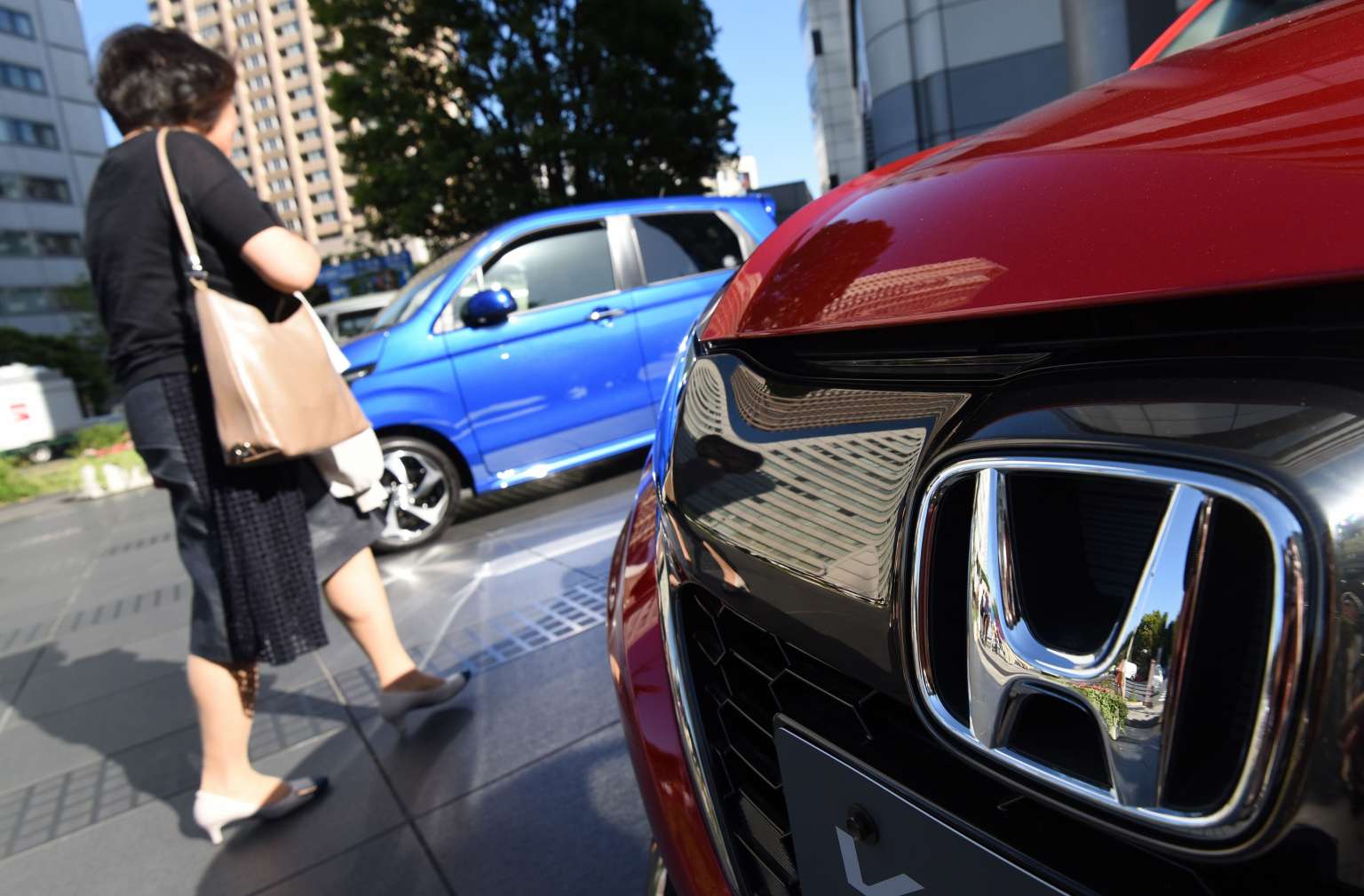 A woman walks past vehicles by Japan's Honda Motor at the company's headquarters in Tokyo on May 13, 2016.