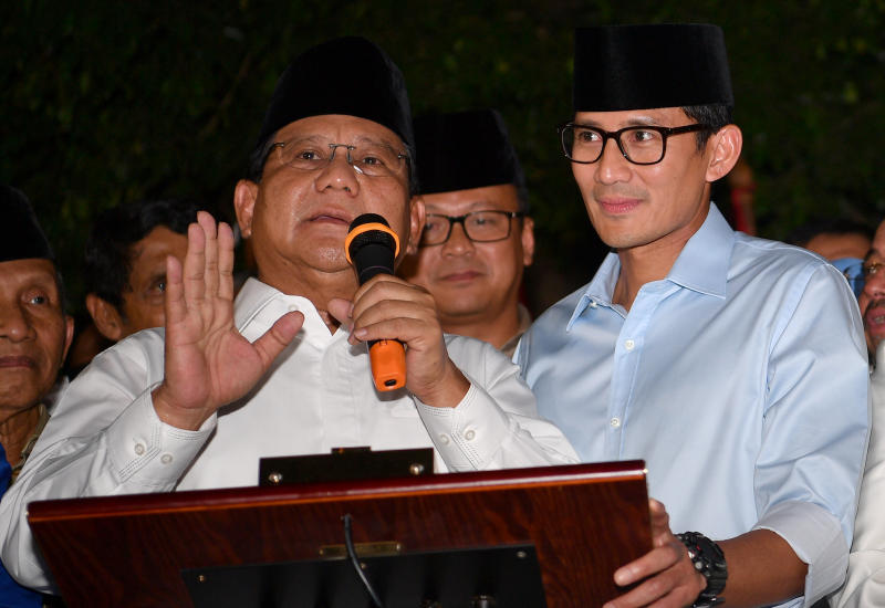 Prabowo Subianto (left) and his vice-presidential mate Sandiaga Uno are contesting in the April presidential elections next year.