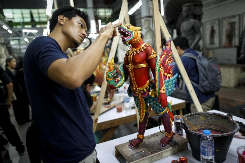 Thai official artists paint deity sculptures which will adorn the elaborate complex of the royal crematorium for late Thai King Bhumibol Adulyadej's funeral ceremony.