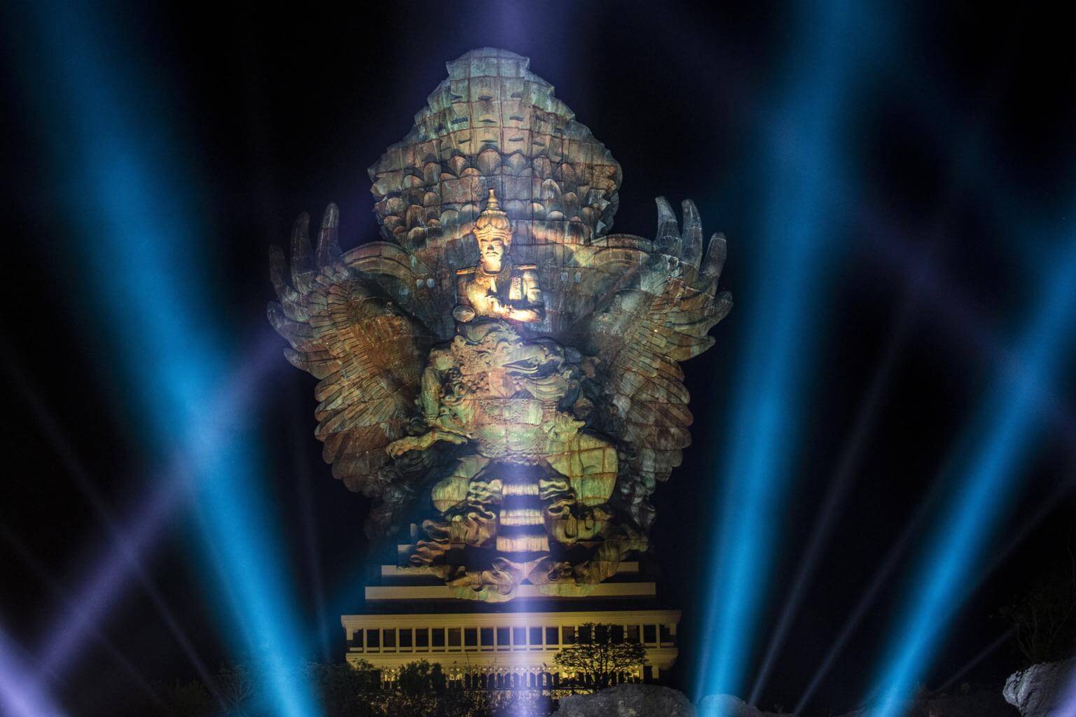 Artificial light illuminates the Garuda Wisnu Kencana statue during the inauguration ceremony in Ungasan, Bali, on Sept 22, 2018.