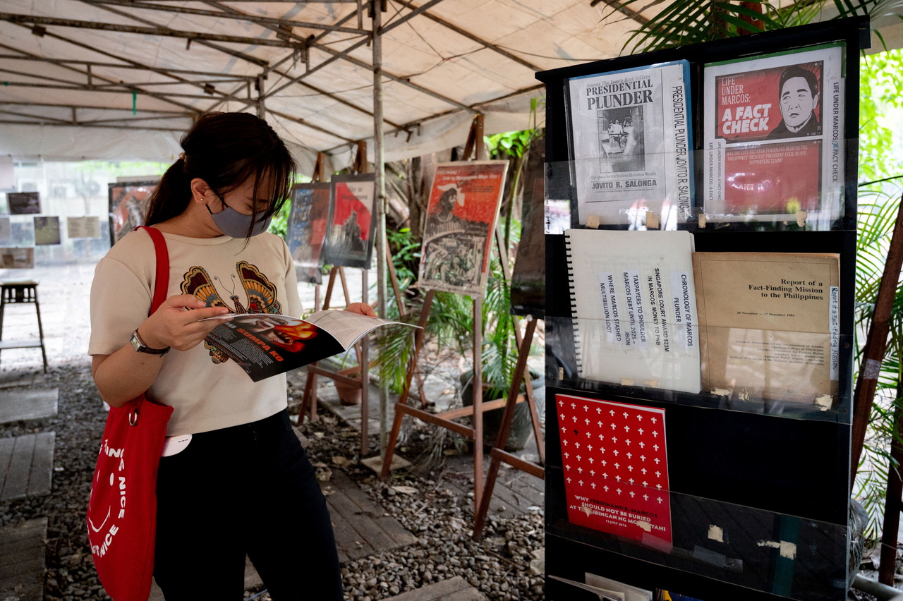 <p>A woman reads a book on martial law under the late dictator Ferdinand Marcos, at the Bantayog ng mga Bayani, in Quezon City, Philippines, May 21, 2022. Picture taken May 21, 2022. REUTERS/Lisa Marie David</p>