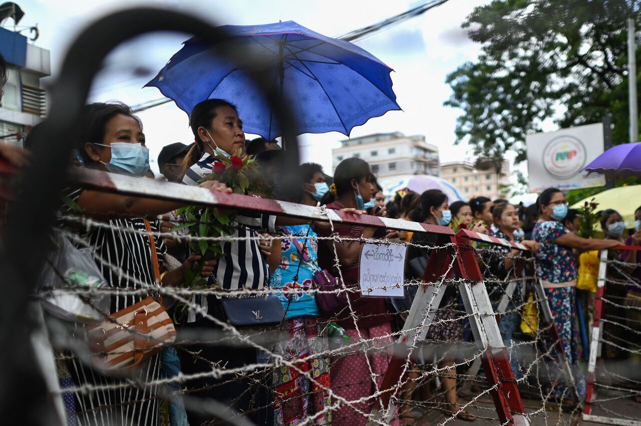 A file photo taken on June 30 shows people waiting in front of Insein prison for the release of prisoners in Yangon.