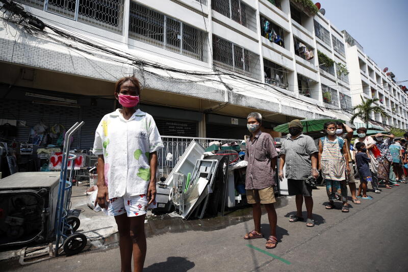 People line up for free food distribution in Bangkok, on April 22, 2020.