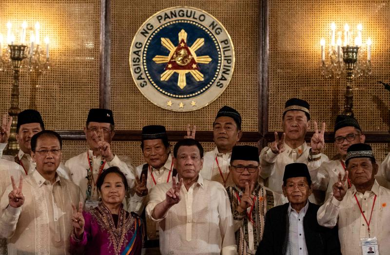 Philippine President Rodrigo Duterte with Moro Islamic Liberation Front chairman Murad Ebrahim (front row, third from right) during the Ceremonial Confirmation of the Bangsamoro Organic Law Plebescite Law Canvass Results and Oath-taking of Transition Authority in Manila on Feb 22, 2019.