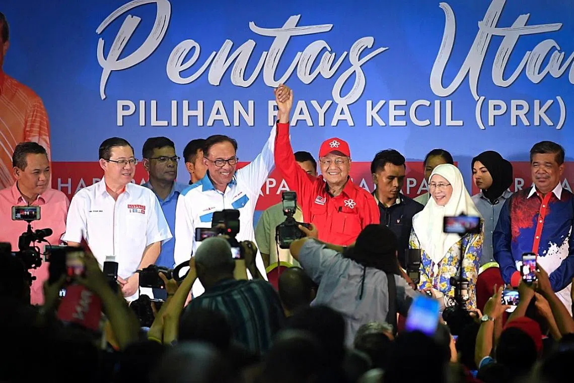Tun Dr Mahathir Mohamad (in red) stumping for Datuk Seri Anwar Ibrahim ahead of the Port Dickson by-election in 2018.