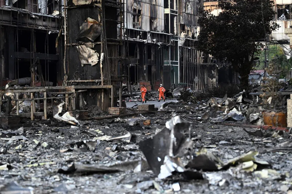A rescue team walks through a burned out part of the Grand Diamond City hotel-casino after a fire at the complex.