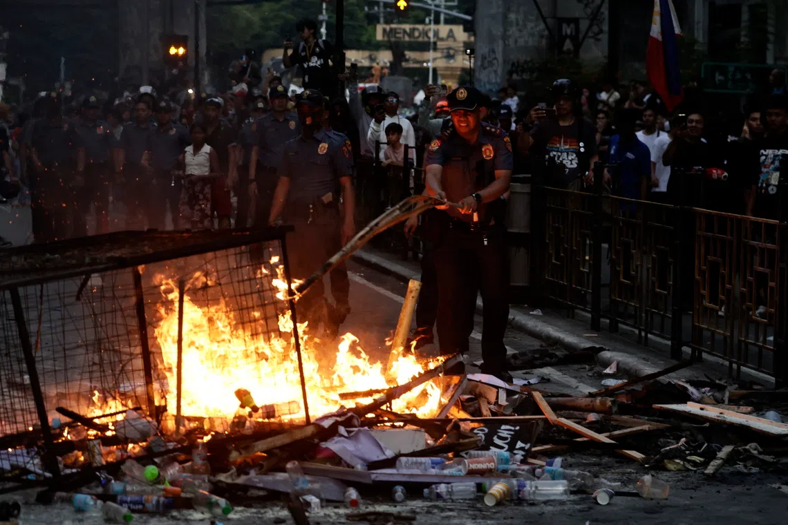 Anti-riot police try to extinguish a street fire during a protest rally in Manila on Sept 21.