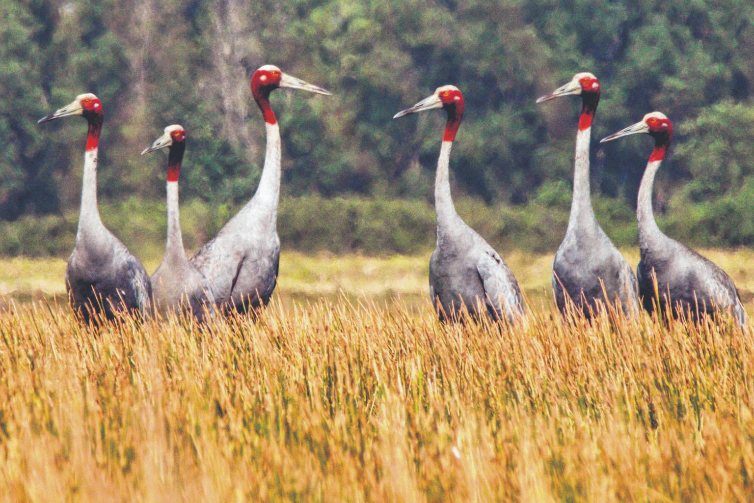 A group of eastern sarus cranes, the tallest bird in the world, stand in a paddy field in Anlung Pring province in Cambodia.