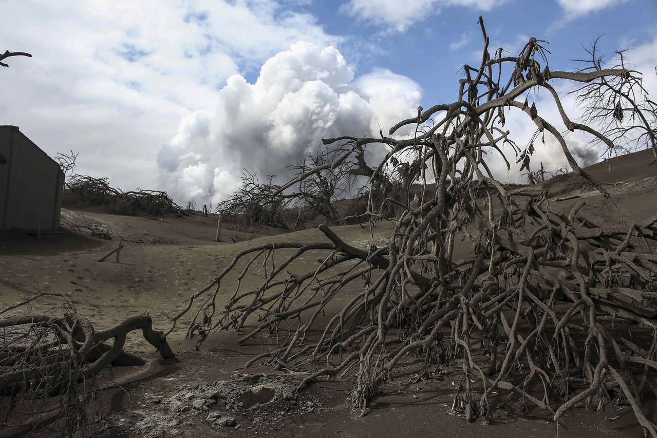 Trees covered in volcanic ash as the Taal volcano continues to spew smoke in Batangas province, Philippines, on Feb 14, 2020.